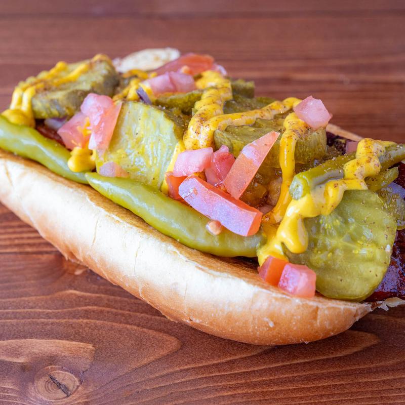 Topped with mustard, relish, onion, pickle, tomato, sport peppers and celery salt.
