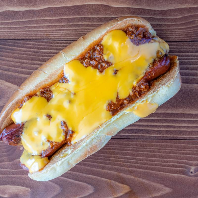 "Carolina-Style" split and charred 1/4 lb Hebrew National all beef hot dog topped with homemade chili and homemade cole slaw.