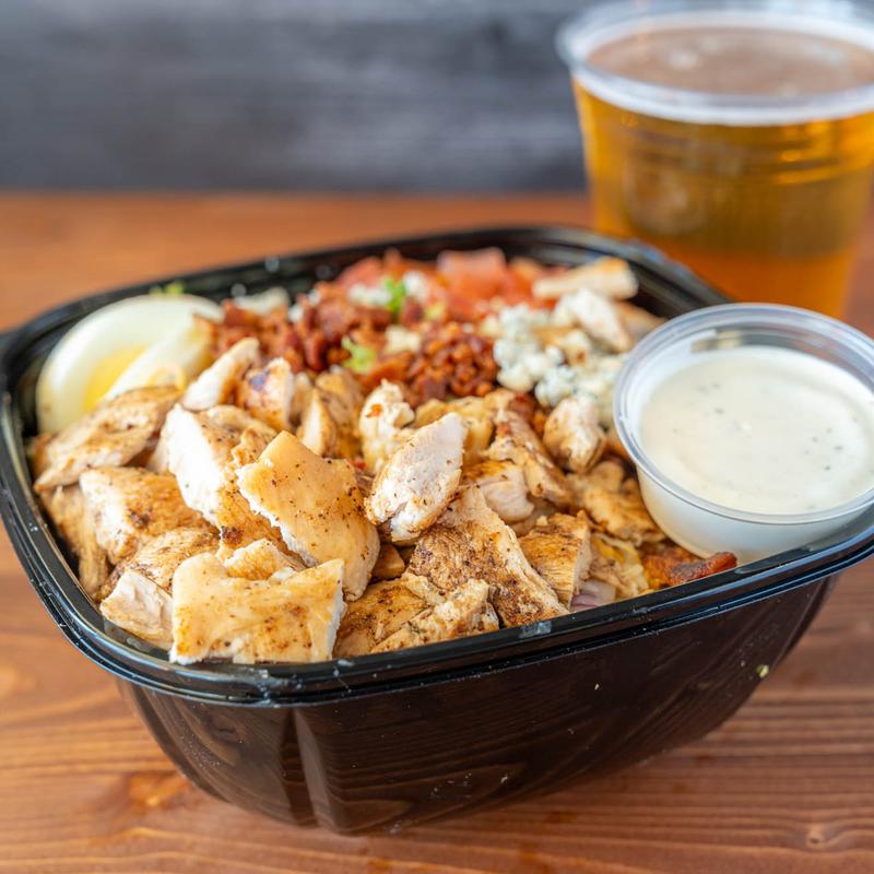 Fresh romaine, onion, tomato, shredded cheese, blue cheese crumbles, bacon bits, and hard boiled egg. Comes with grilled or fried chicken.